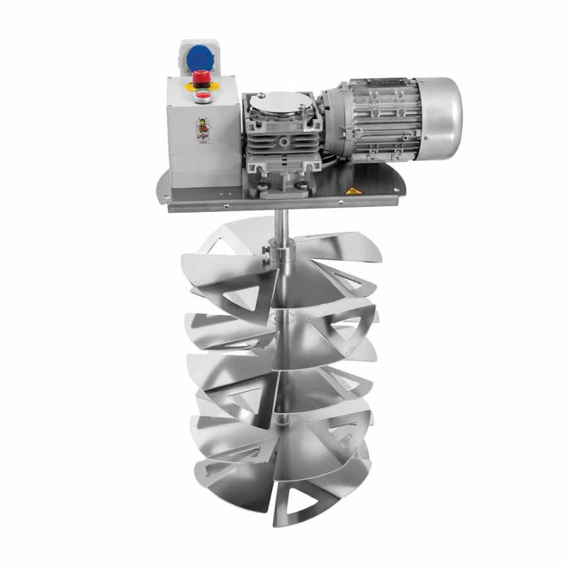 Mieszanie odbywa się przy pomocy silnika z przekładnią. Na wale zamontowano dwie pary przeciwstawnych łopatek mieszających o efekcie próżniowym oraz dodatkową łopatę z regulacją wysokości. Mikrowyłącznik bezpieczeństwa przerywa pracę urządzenia po otwarciu pokrywy. W najniższym punkcie dna znajduje się wbudowany zawór kulowy 6/4'' umożliwiający wypływ.