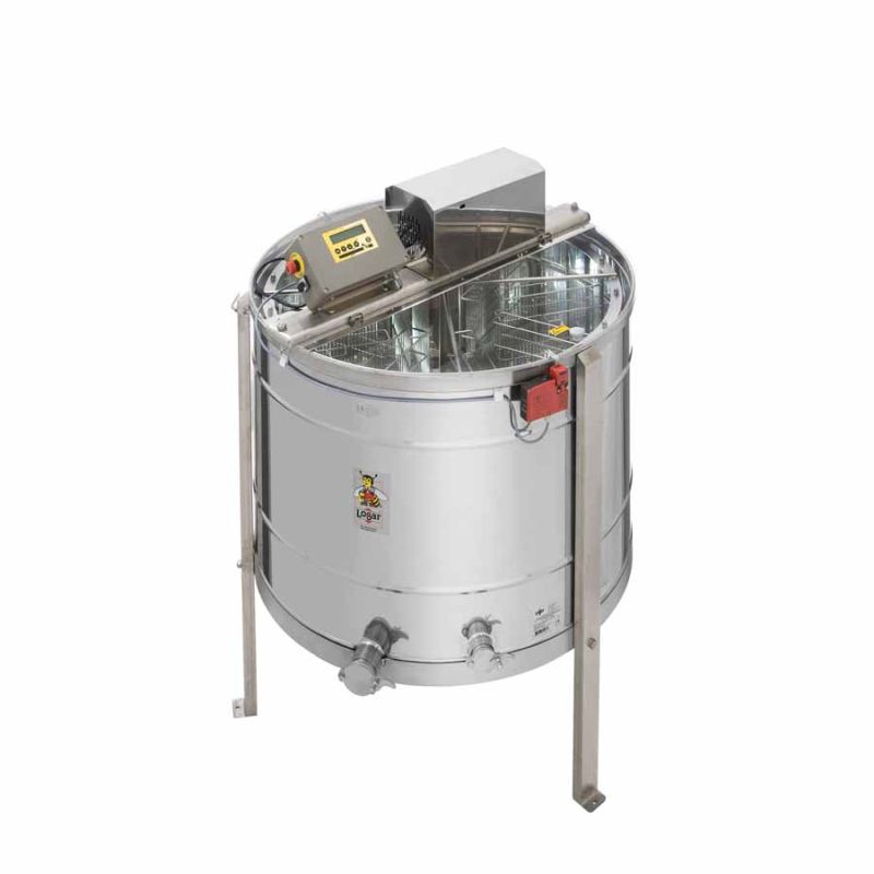 6-plastrów odwirowywarka samowywrotna marki Logar z napędem 370 W / 230 V i w pełni automatycznym sterowaniem. Wirówka posiada zintegrowane zabezpieczenie, które przy otwarciu pokrywy automatycznie wyłącza silnik. Nowoczesne wykonanie dna kadzi: bezszwowo spawane i nachylone w kierunku wylotu, co zapewnia bardzo dobre spływanie miodu.