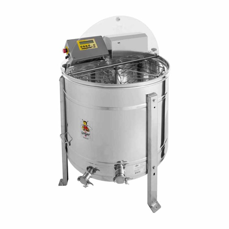 4-ramkowa odwirowywarka samoczynna z napędem silnikowym 180 W / 230 V i w pełni automatycznym sterowaniem. Wyposażona jest w zintegrowany wyłącznik bezpieczeństwa, który automatycznie wyłącza silnik po otwarciu pokrywy. Nowoczesna konstrukcja pozwoliła na innowacyjne rozwiązanie dna wirówki. Dno kadzi jest spawane bezszwowo i pochylone w kierunku wylotu. Stalowy, nierdzewny kranik spustowy zamontowano w najniższym możliwym punkcie, dzięki czemu cały miód może swobodnie spłynąć z wirówki. Wszystkie elementy mające kontakt z miodem wykonano z materiałów dopuszczonych do kontaktu z żywnością. Pokrywa wykonana jest z przezroczystego akrylu. Ta odwirowywarka umożliwia przetwarzanie większych ramek o wysokości do 28,6 cm. W związku z tym pokrywa jest otwierana ponad silnikiem za pomocą specjalnych zawiasów.
