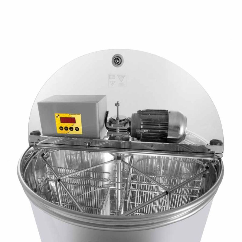 Samoczynna wirówka do miodu na 4 ramki z napędem elektrycznym 110 W/230 V, pełną automatyką sterującą oraz wyłącznikiem bezpieczeństwa, który odcina silnik po otwarciu pokrywy. Nowoczesna technika pozwoliła na innowacyjne rozwiązanie dna kadzi wirówki. Dno kadzi jest spawane bezszwowo i pochylone w stronę odpływu. Nierdzewny kran zaciskowy jest przyspawany w najniższym możliwym punkcie, dzięki czemu cały miód może swobodnie wypłynąć z wirówki. Wszystkie części wirówki mające kontakt z miodem wykonane są z materiałów dopuszczonych do użycia w kontakcie z żywnością. Pokrywa wykonana jest z przezroczystego akrylu. Specjalna konstrukcja nóżek zapewnia wirówce stabilne podparcie.