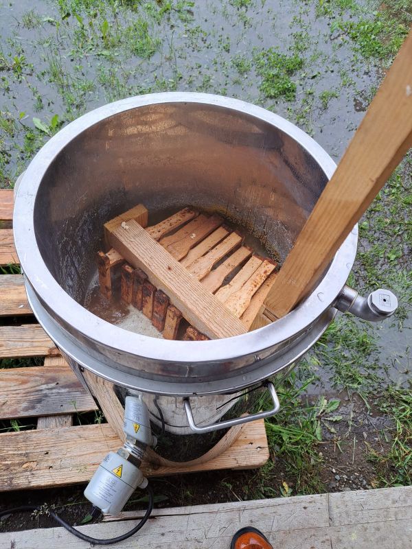 Trójwarstwowy sterylizator wosku z izolacją, przeznaczony do unieszkodliwiania zarodników Nosema i zgnilca w wosku pszczelim.Zbiornik do oczyszczania wosku jest w pierwszej kolejności przeznaczony do zastosowań w pszczelarstwie i przy wytapianiu świec: