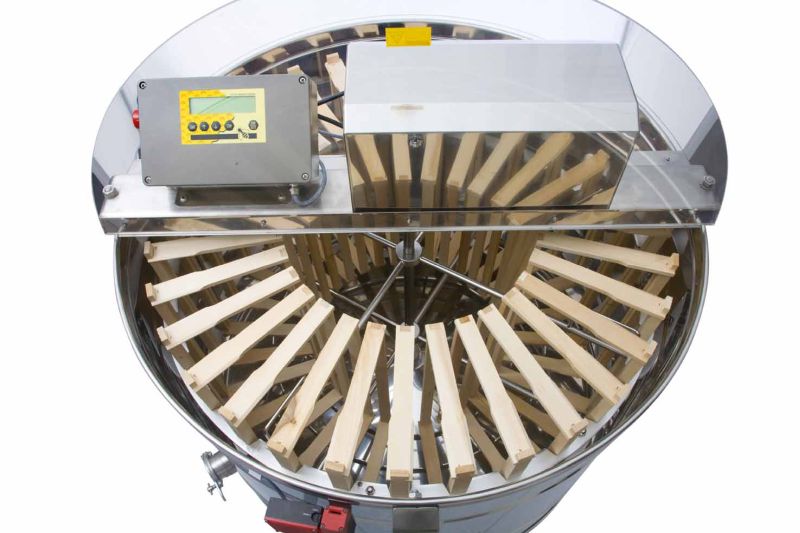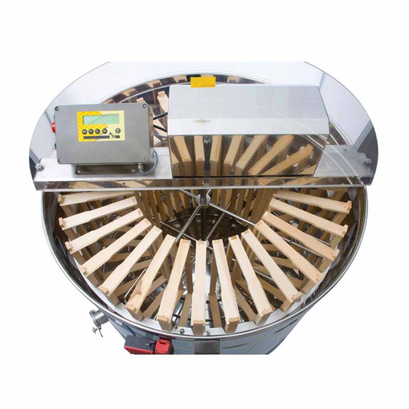 Radialna wirowarka do miodu na 32 ramki, z napędem silnikowym 370 W / 230 V, w pełni automatycznym sterowaniem i zintegrowanym zabezpieczeniem, które wyłącza silnik po otwarciu pokrywy. Nowoczesna konstrukcja obejmuje innowacyjne wykonanie dna zbiornika: dno jest bezszwowo zespawane i pochylone w kierunku wypustu. Wirowarka posiada dwa nierdzewne zawory spustowe (6/4'' i 2''). Zawór 2'' zamontowano w najniższym możliwym punkcie, aby cały miód mógł swobodnie wypłynąć ze zbiornika. Wszystkie elementy mające kontakt z miodem wykonane są z materiałów dopuszczonych do kontaktu z żywnością. Pokrywa wykonana jest z przezroczystego akrylu.
