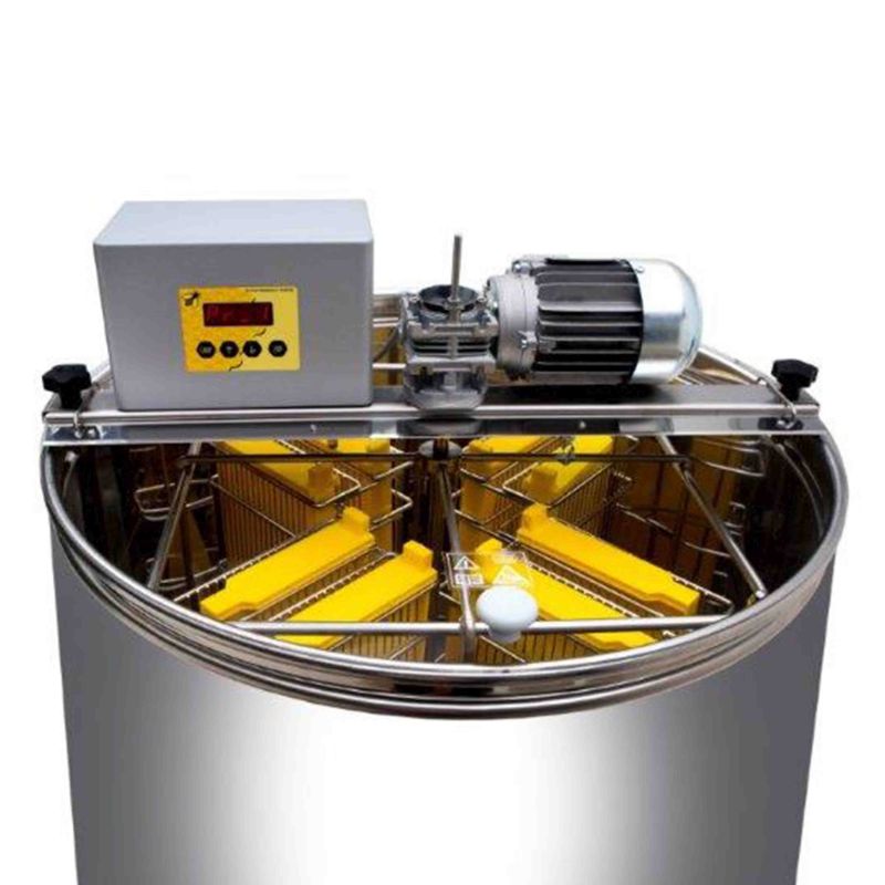 8-ramek samozmieniająca wirówka z napędem elektrycznym 110 W/230 V, w pełni automatycznym sterowaniem oraz wyłącznikiem bezpieczeństwa, który automatycznie zatrzymuje silnik po otwarciu pokrywy. Kieszenie na ramki w wirówce są podwójne, pomiędzy nimi znajduje się blacha, po której spływa miód. Najnowsze rozwiązania techniczne pozwoliły na innowacyjne zaprojektowanie dna kadzi wirówki. Dno kadzi jest spawane bezszwowo i skośnie skierowane w stronę wylotu. Zaciskowy kran miodowy ze stali nierdzewnej jest przyspawany w najniższym możliwym punkcie, tak aby cały miód mógł spłynąć z wirówki. Wszystkie części wirówki mające kontakt z miodem wykonane są z materiałów dopuszczonych do kontaktu z żywnością. Pokrywa wykonana jest z przezroczystego akrylu. Specjalna konstrukcja nóżek zapewnia wirówce stabilne i bezpieczne ustawienie.