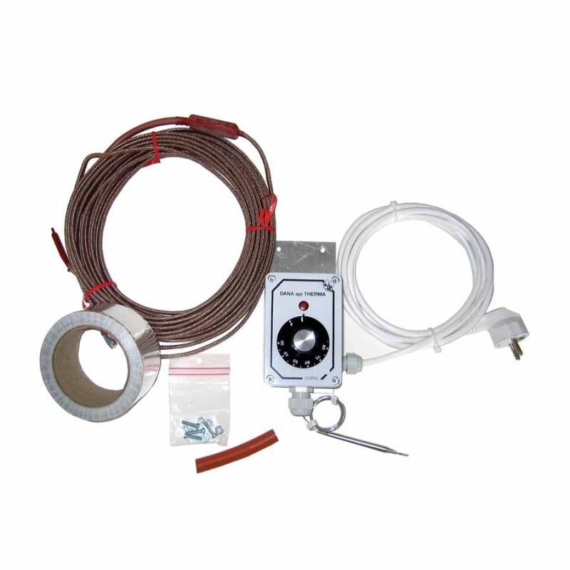 Zestaw zawiera wszystko, co niezbędne do montażu przewodu grzewczego pod dnem wirówki lub zbiornika. W komplecie znajduje się szczegółowa instrukcja montażu. Przy wielodniowym odwirowywaniu mogą powstawać kryształy miodu, które sklejają wirówkę lub zbiornik. Delikatne podgrzewanie dna powoduje rozpuszczenie skrystalizowanego miodu i zapewnia równomierny przepływ. Dołączony czujnik temperatury kontroluje temperaturę i zapobiega przegrzewaniu.